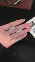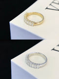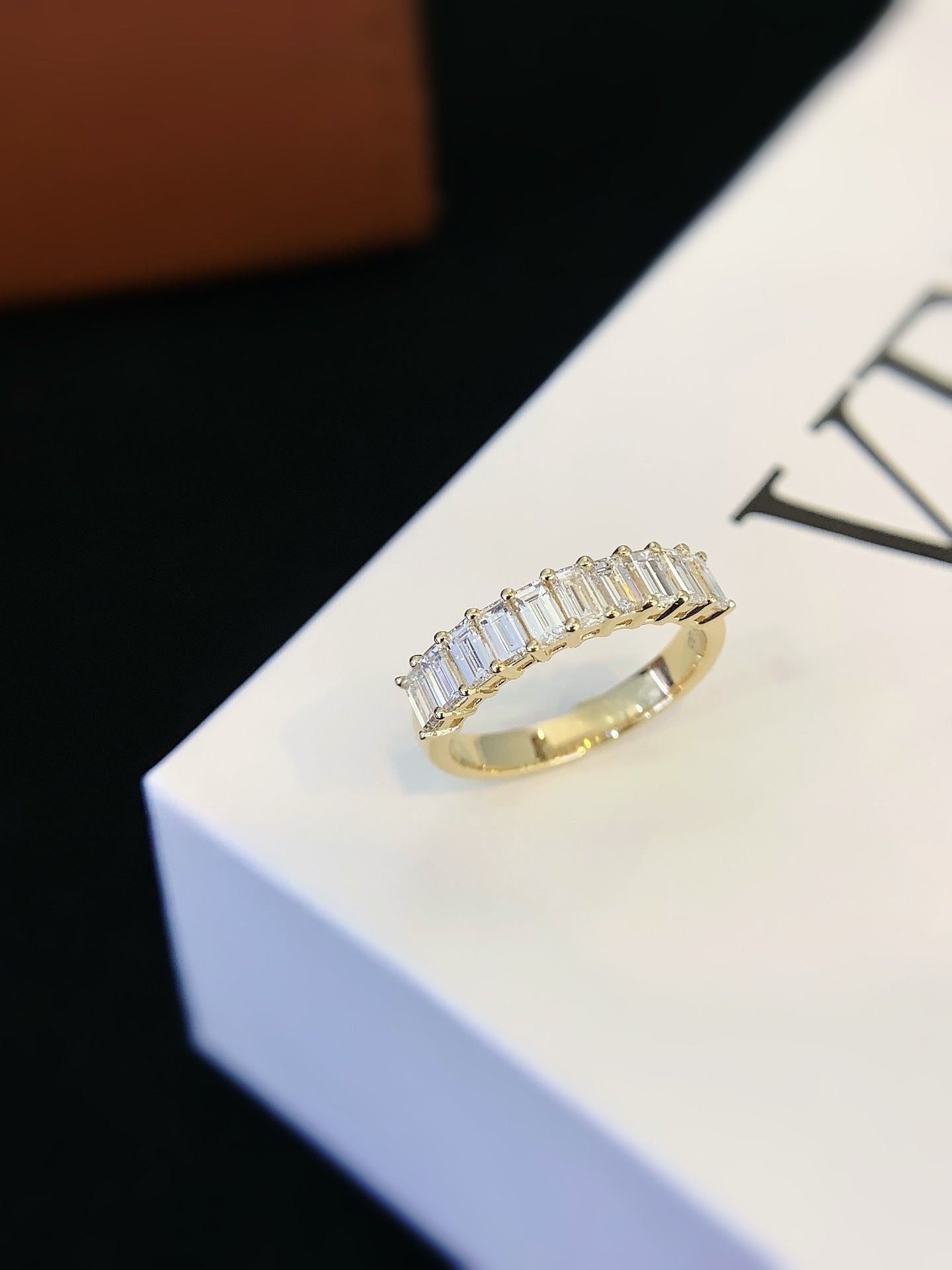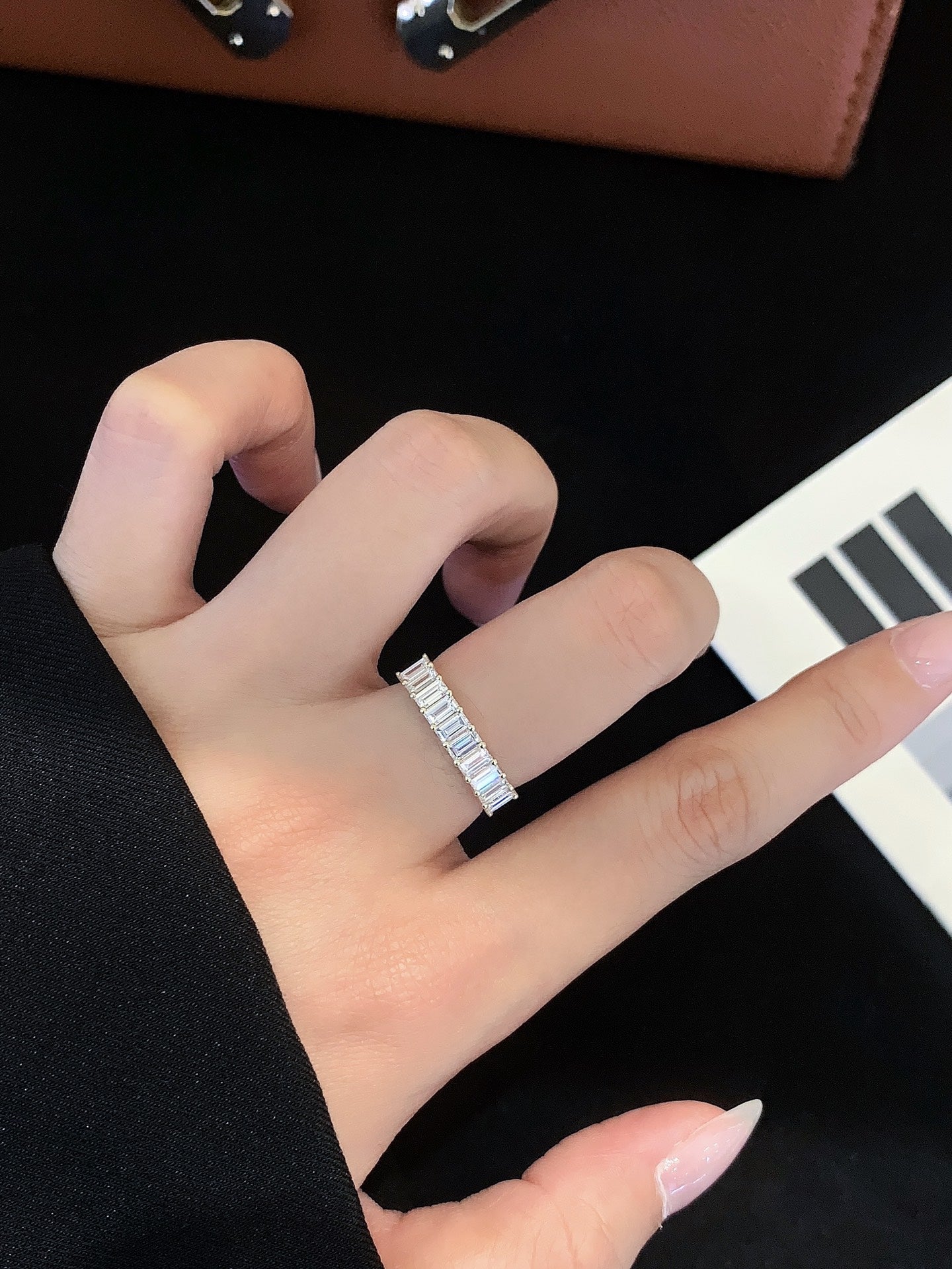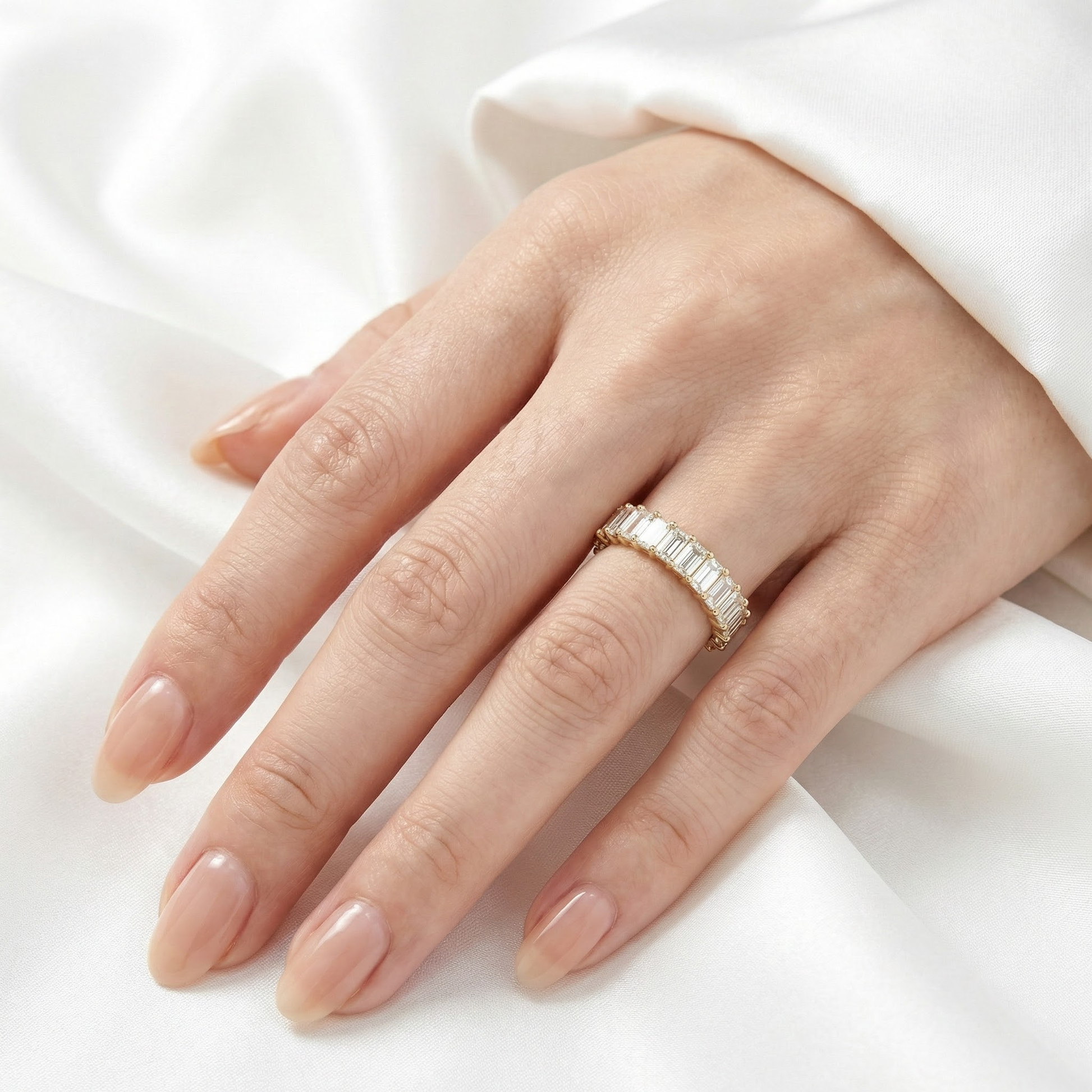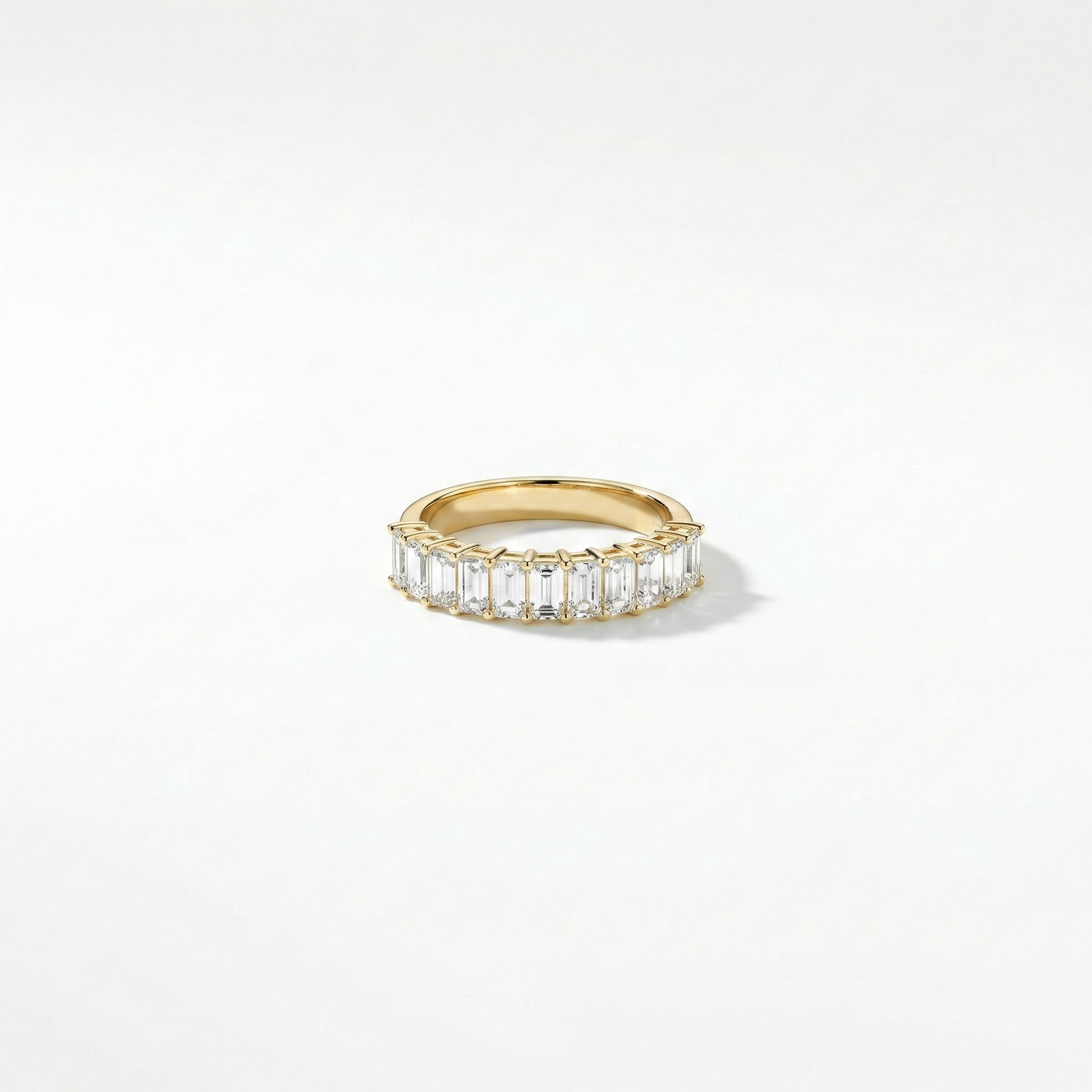The continuous line of emerald-cut diamonds creates a refined, balanced look, making it suitable for everyday wear or as a wedding and anniversary band.