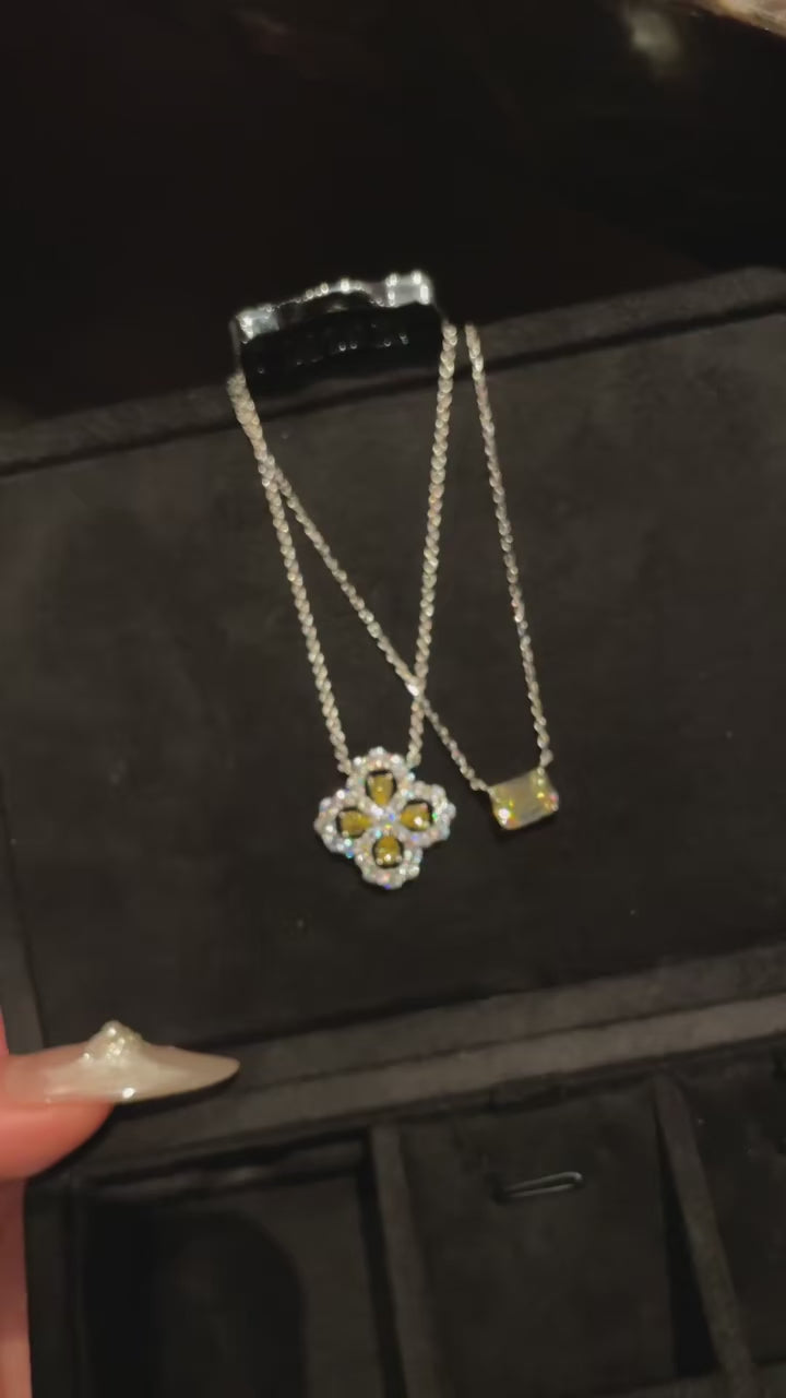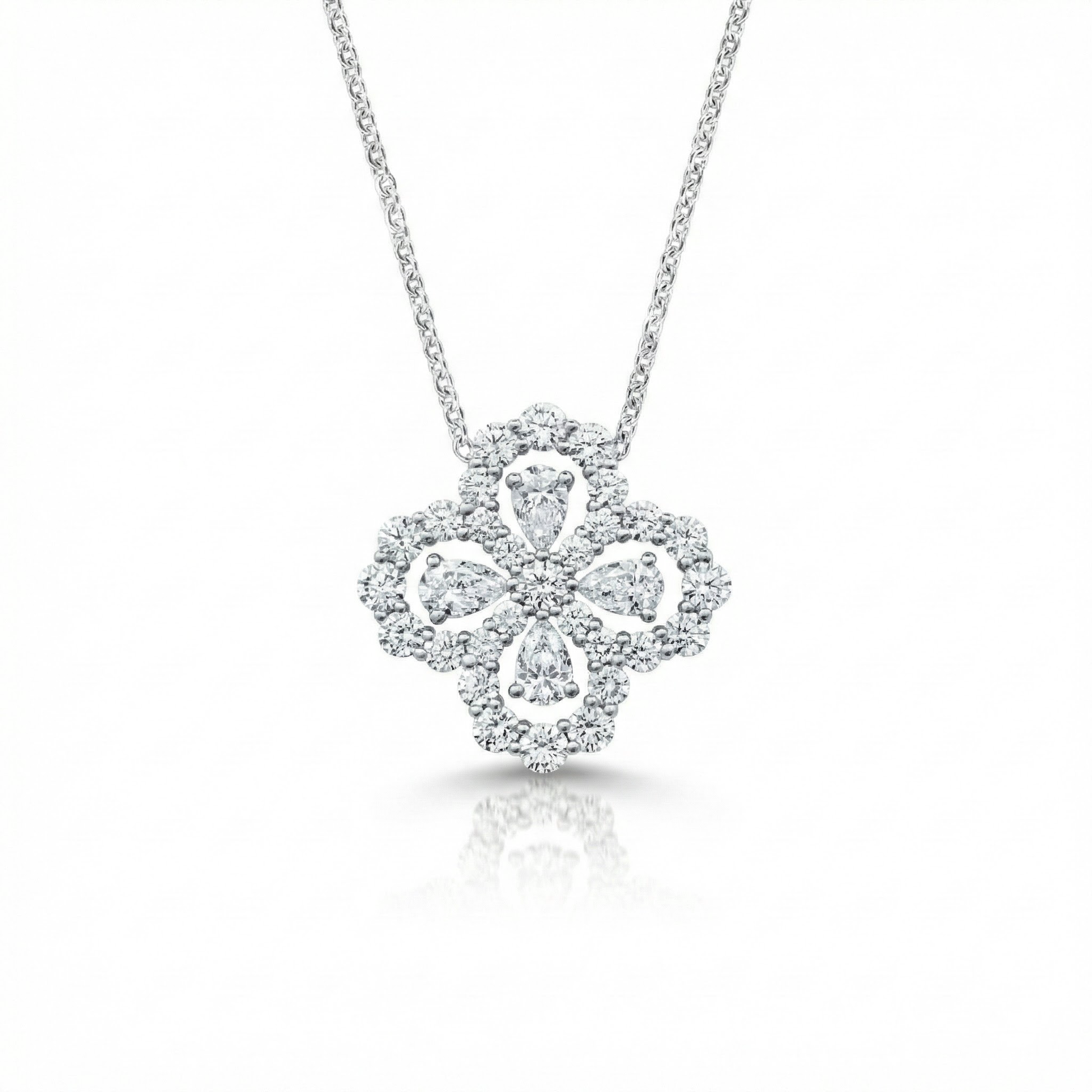 This pendant is designed in a refined quatrefoil silhouette, formed by four pear-shaped stones radiating from the center. A delicate pavé halo frames the design, enhancing brilliance while adding dimension and balance to the overall form.
