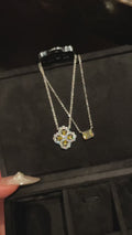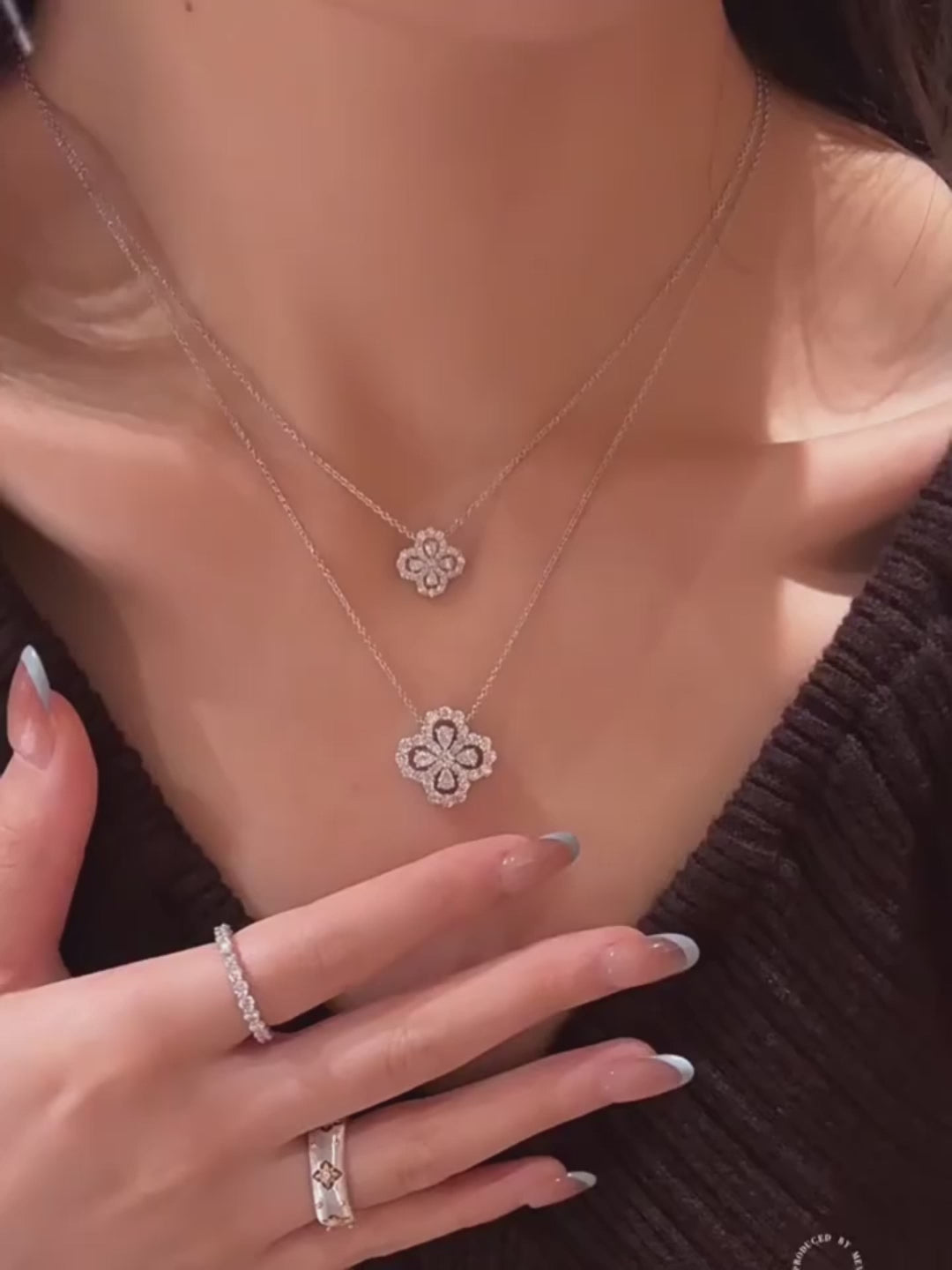 The symmetrical structure creates a sense of harmony and elegance, blending soft curves with precise geometry. Suspended from a fine chain, the pendant sits gracefully at the neckline, offering a timeless statement that feels both classic and contemporary.