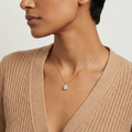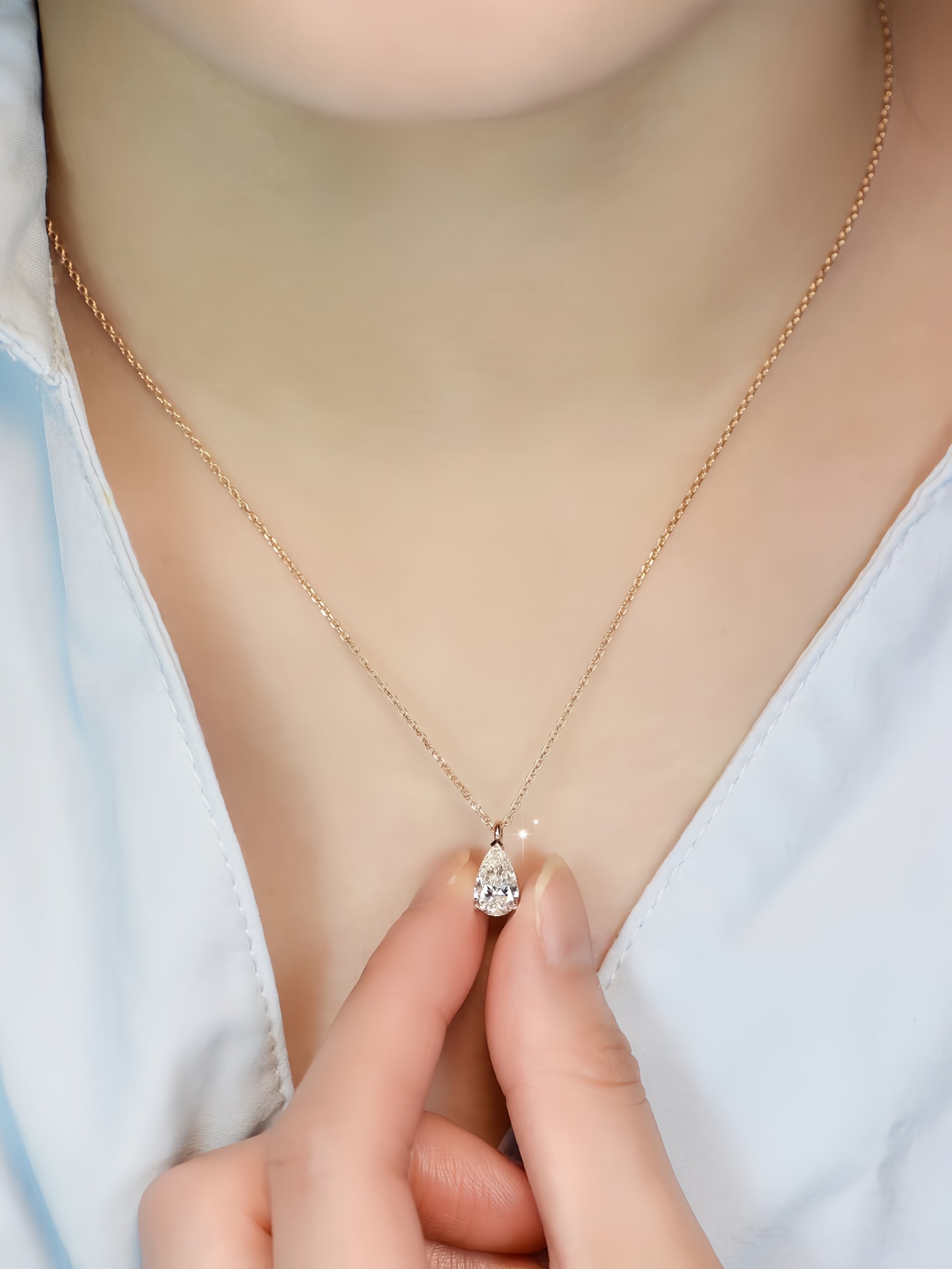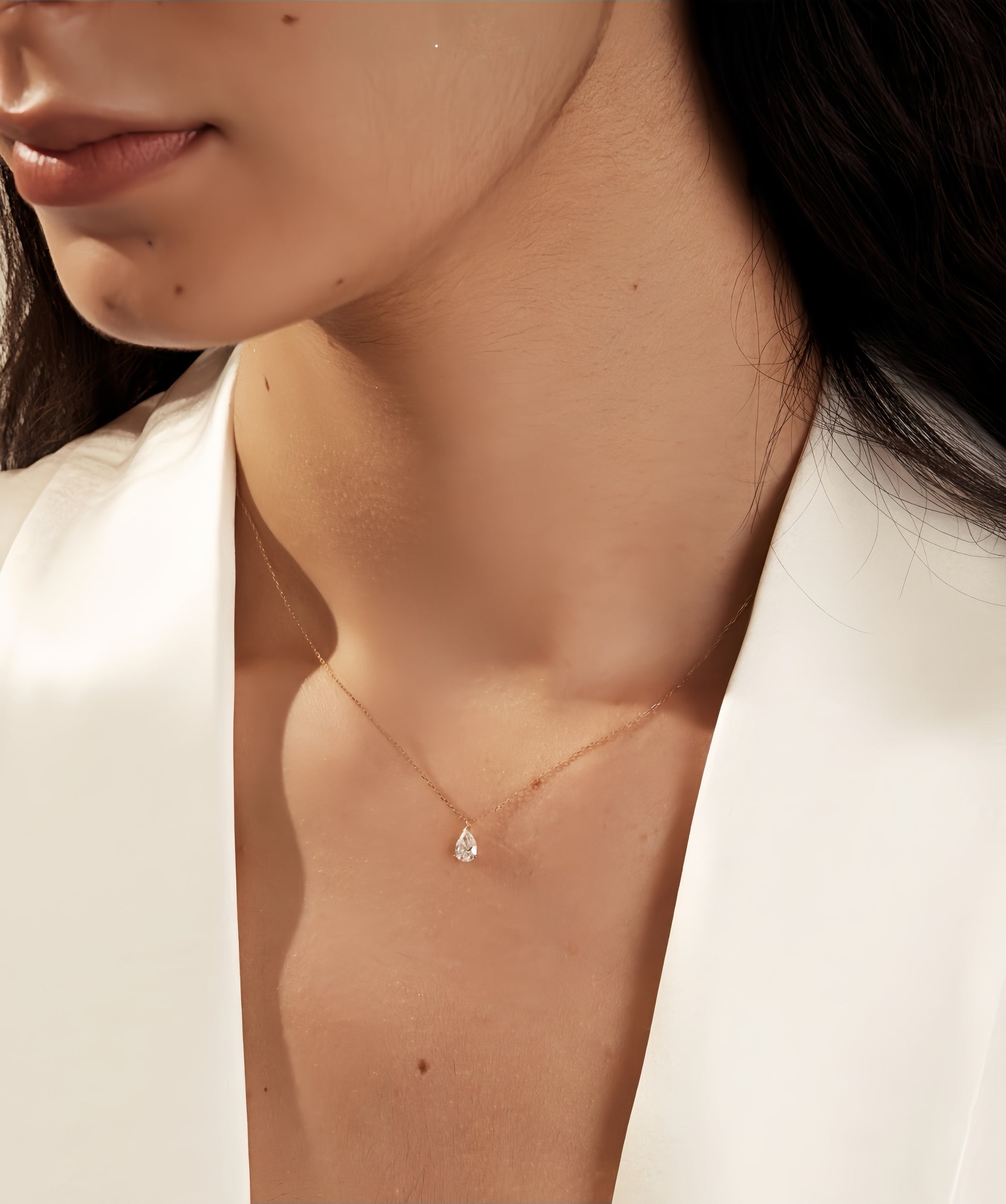 This necklace features a graceful pear-shaped center stone, suspended from a fine gold chain for a clean and elegant look. The minimalist three-prong setting allows light to flow freely through the stone, enhancing its brilliance while maintaining a delicate silhouette.