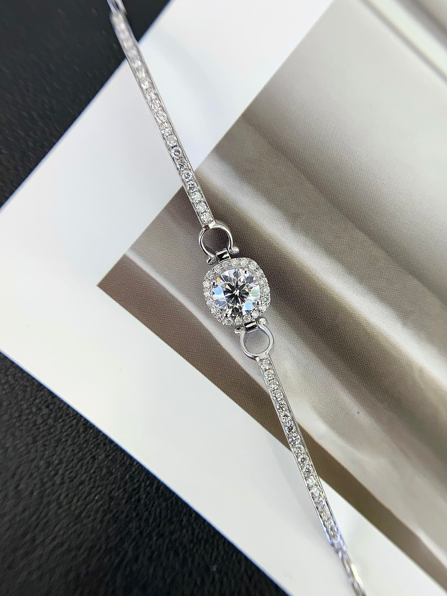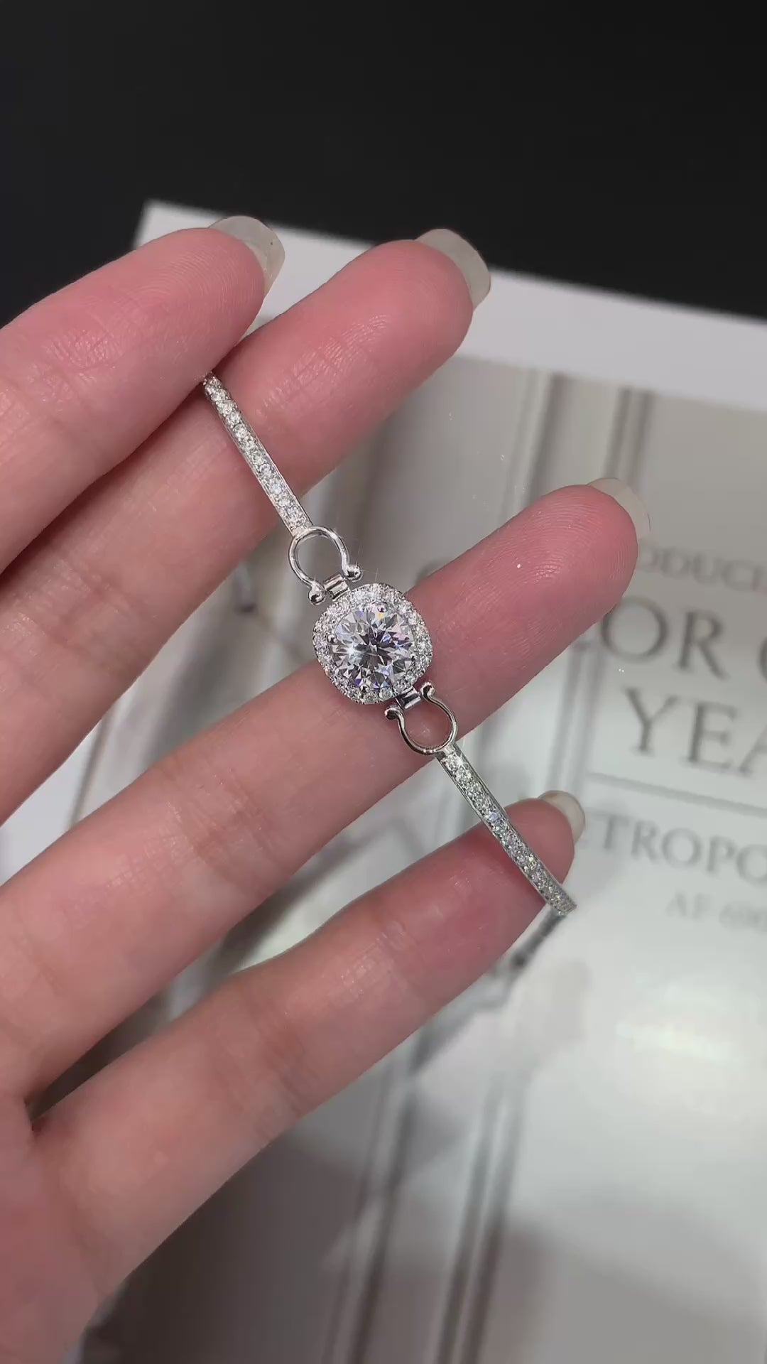 This bracelet features a round center stone framed by a refined halo, seamlessly connected to slender pavé-set links that extend along the wrist. The balanced composition creates a continuous line of sparkle while keeping the overall profile light and elegant.