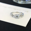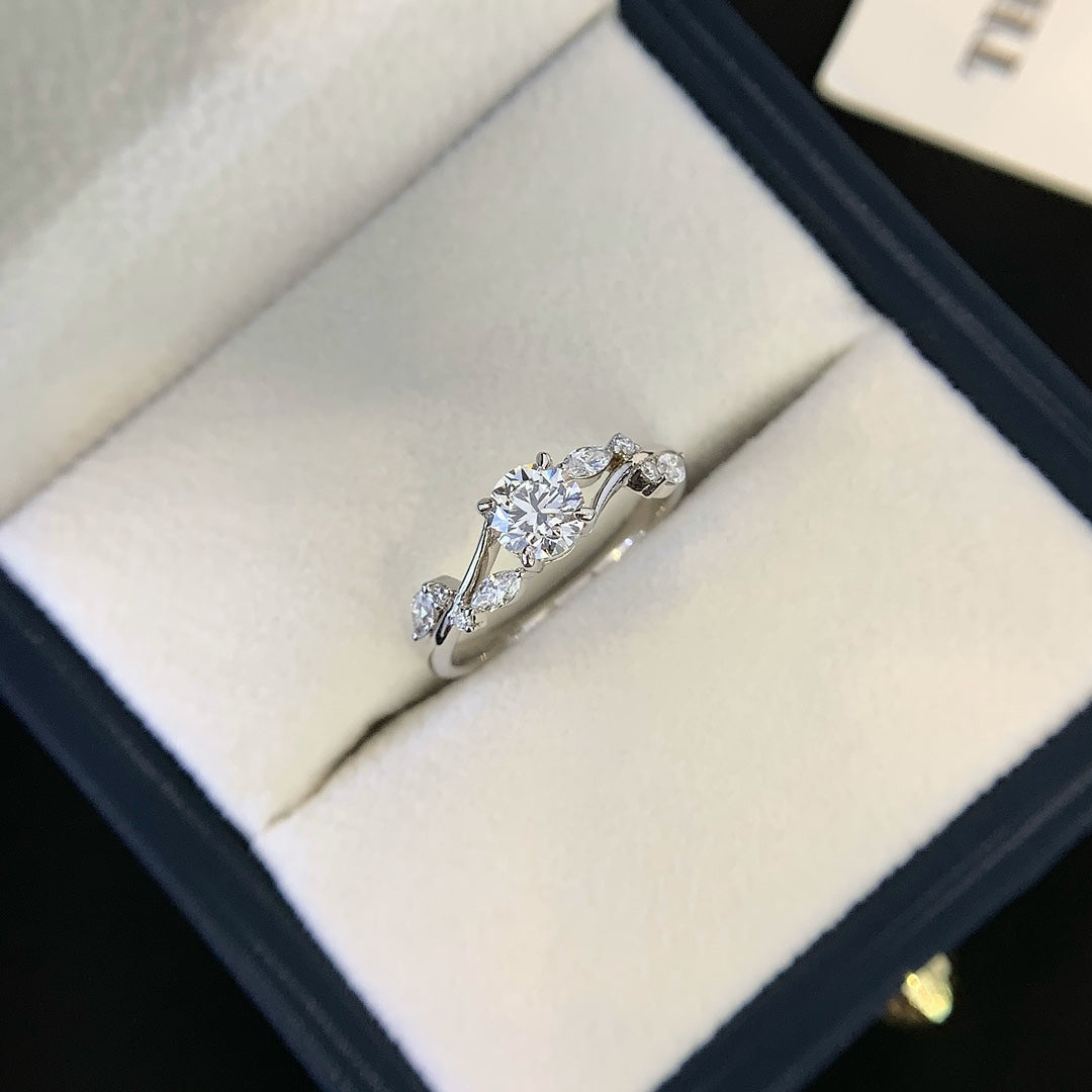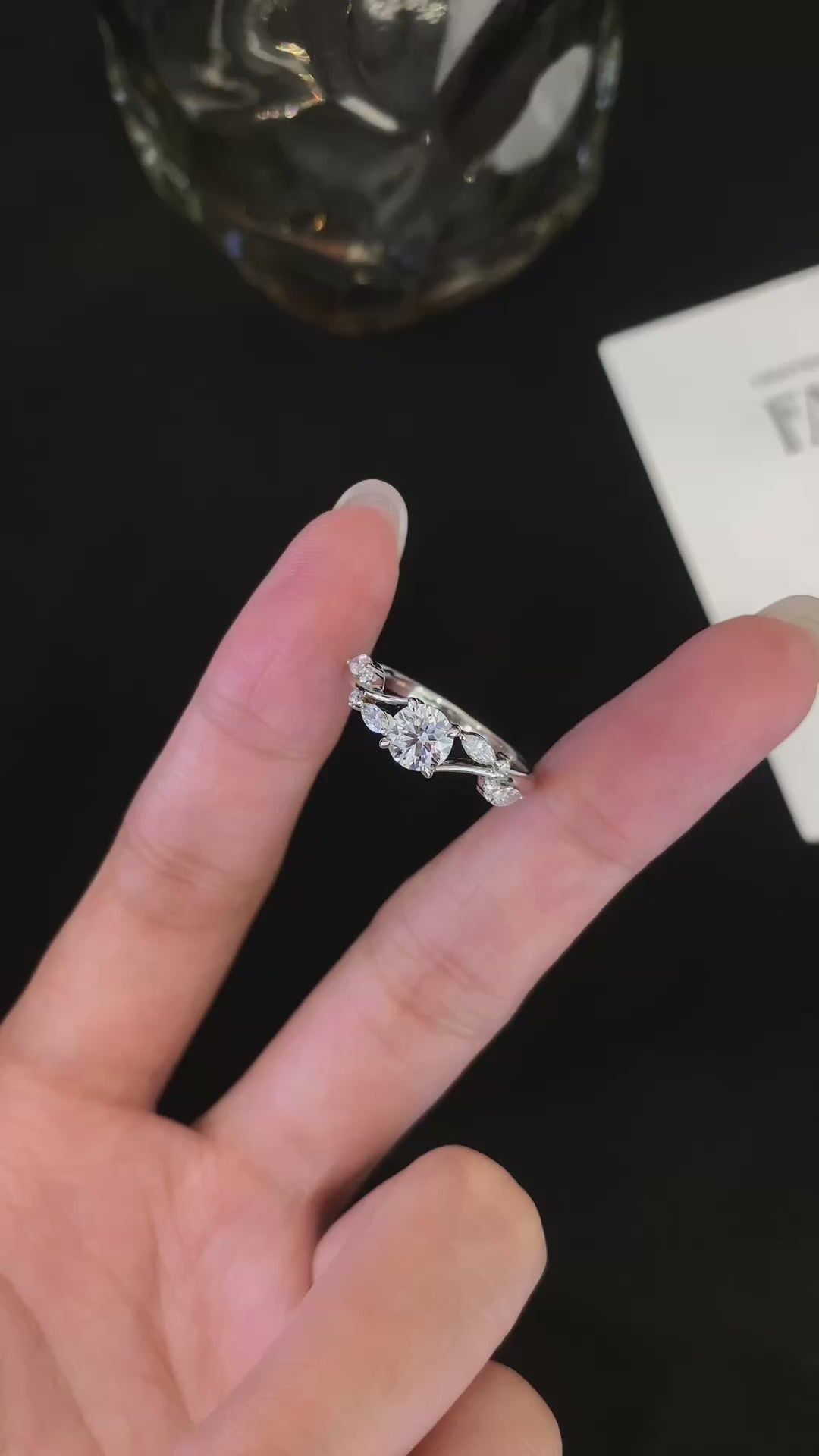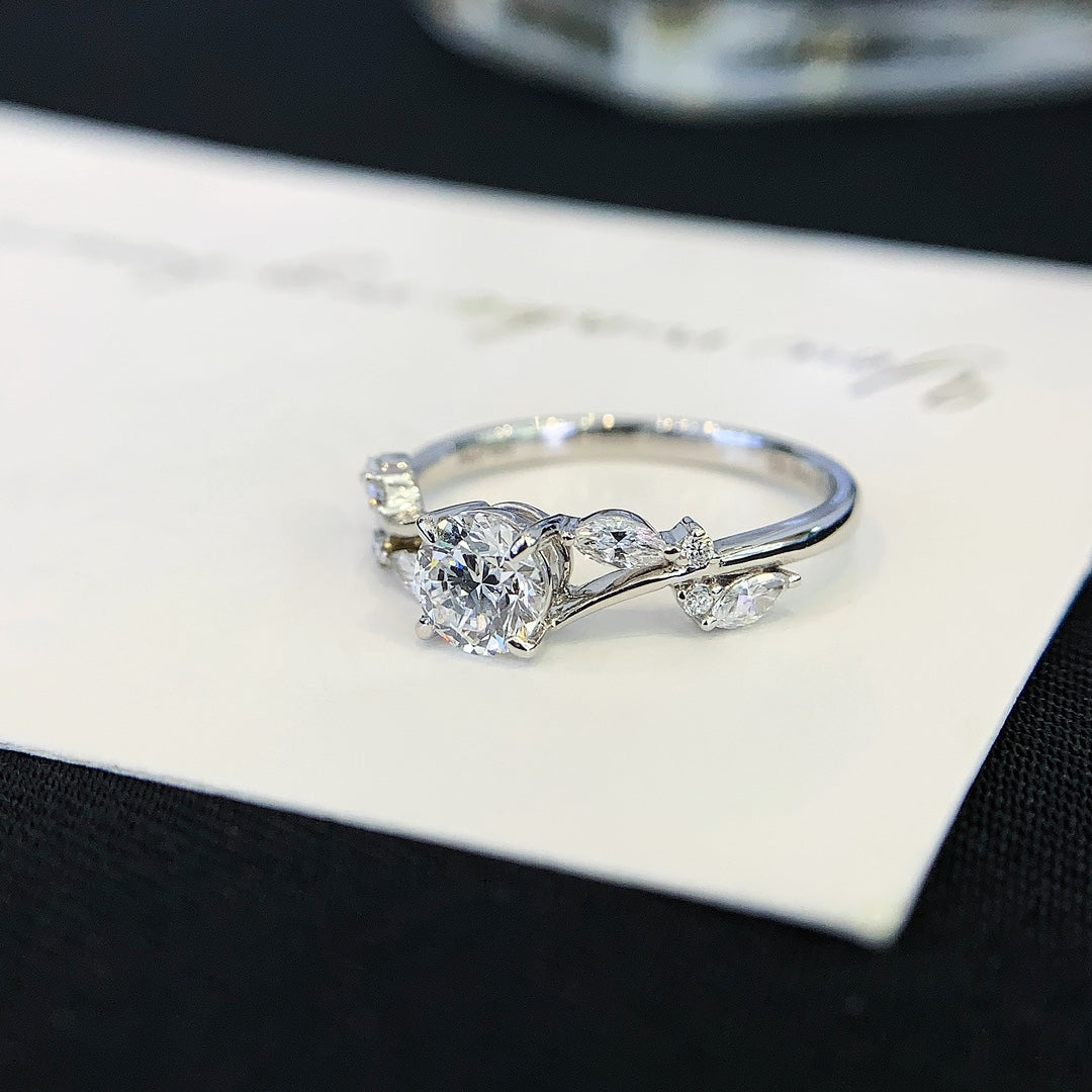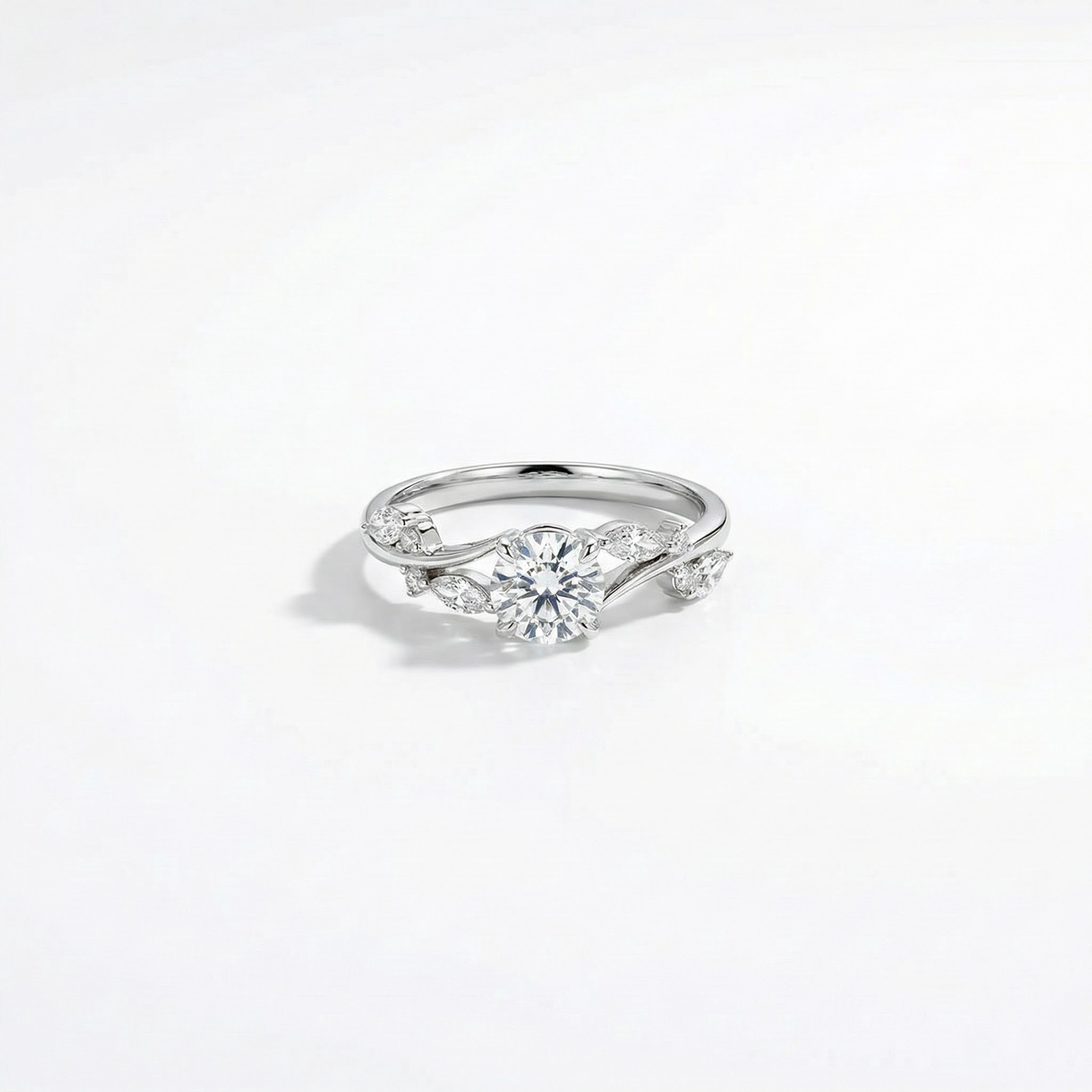 This ring features a brilliant round-cut center stone set in a classic solitaire, framed by an organically sculpted vine-inspired band. Delicate marquise-cut accents and petite round stones flow along the shank, creating a sense of natural movement and soft asymmetry.